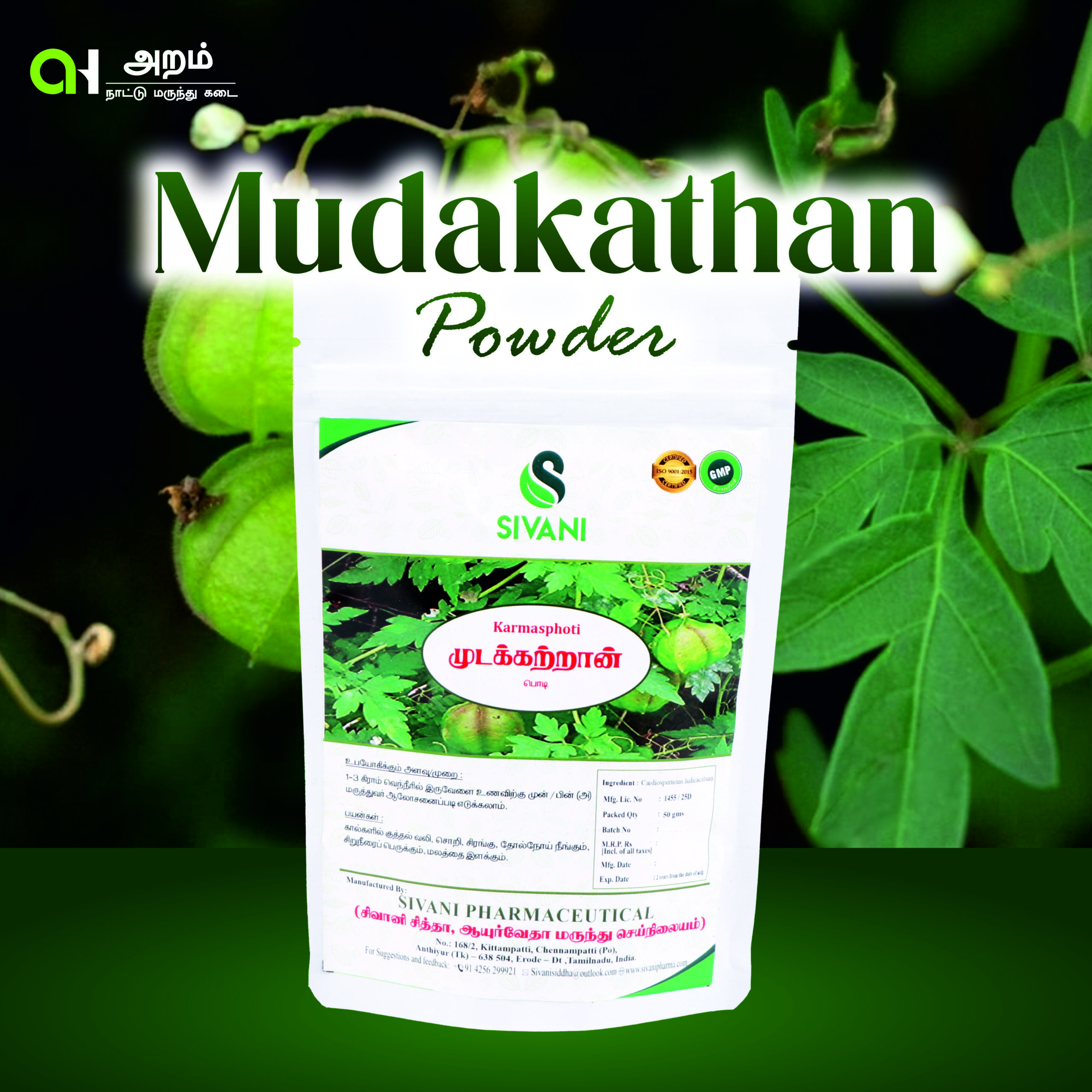 Mudakathan Powder, made from the leaves of the Balloon Vine plant (Cardiospermum halicacabum), is a traditional herbal remedy known for its powerful anti-inflammatory and joint-supporting properties. Widely used in Siddha and Ayurvedic practices, it is especially effective in relieving joint pain, arthritis, swelling, and stiffness. It also promotes skin health, enhances digestion, and boosts overall strength and vitality.