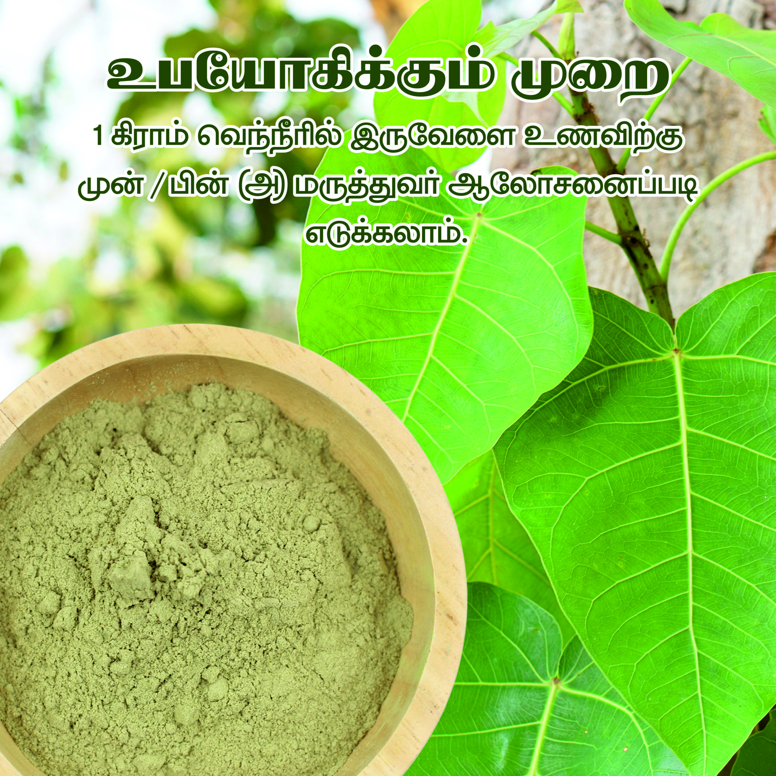 Arasam Pattai (Ficus religiosa – Sacred Fig tree bark) is highly valued in Siddha and Ayurvedic medicine for its therapeutic properties. The powdered form of Arasam Pattai is traditionally used for managing blood sugar levels, treating skin infections, healing wounds, piles, ulcers, and improving digestion.