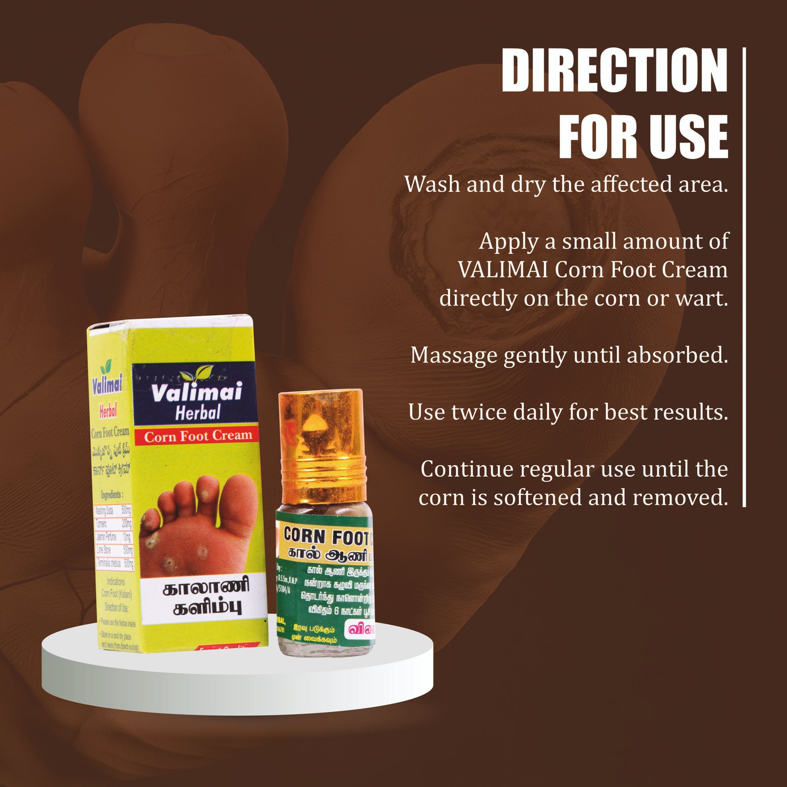 Corn Foot Cream (காலாணி களிம்பு) is specially prepared to help manage foot corns, thickened skin, and hardened areas caused by friction and pressure. Its herbal formulation helps soften the affected area, reduce discomfort, and support natural skin healing with regular application.