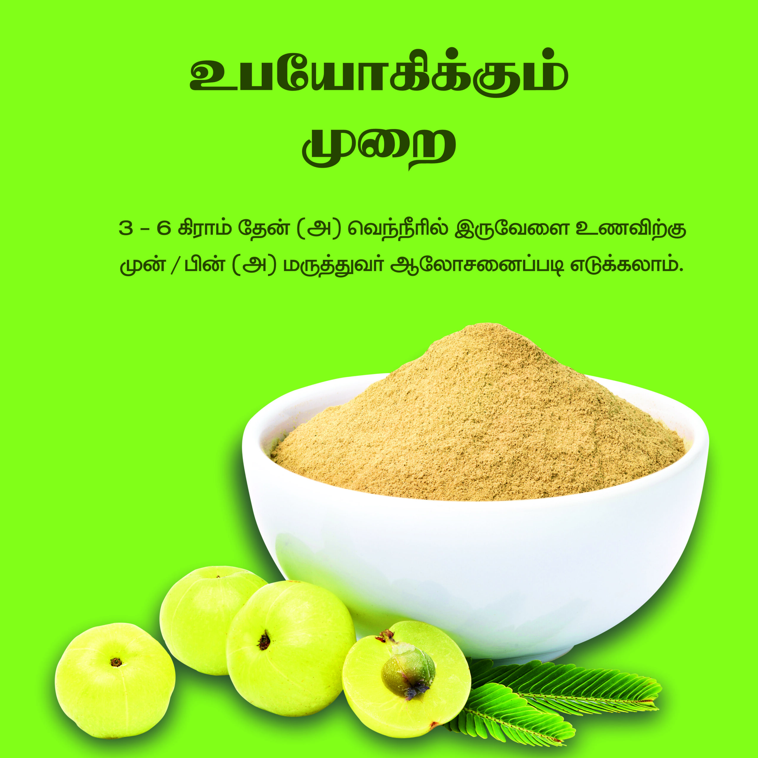👉 Mix 1 tsp of Nellikkai Powder with warm water or honey and consume daily.