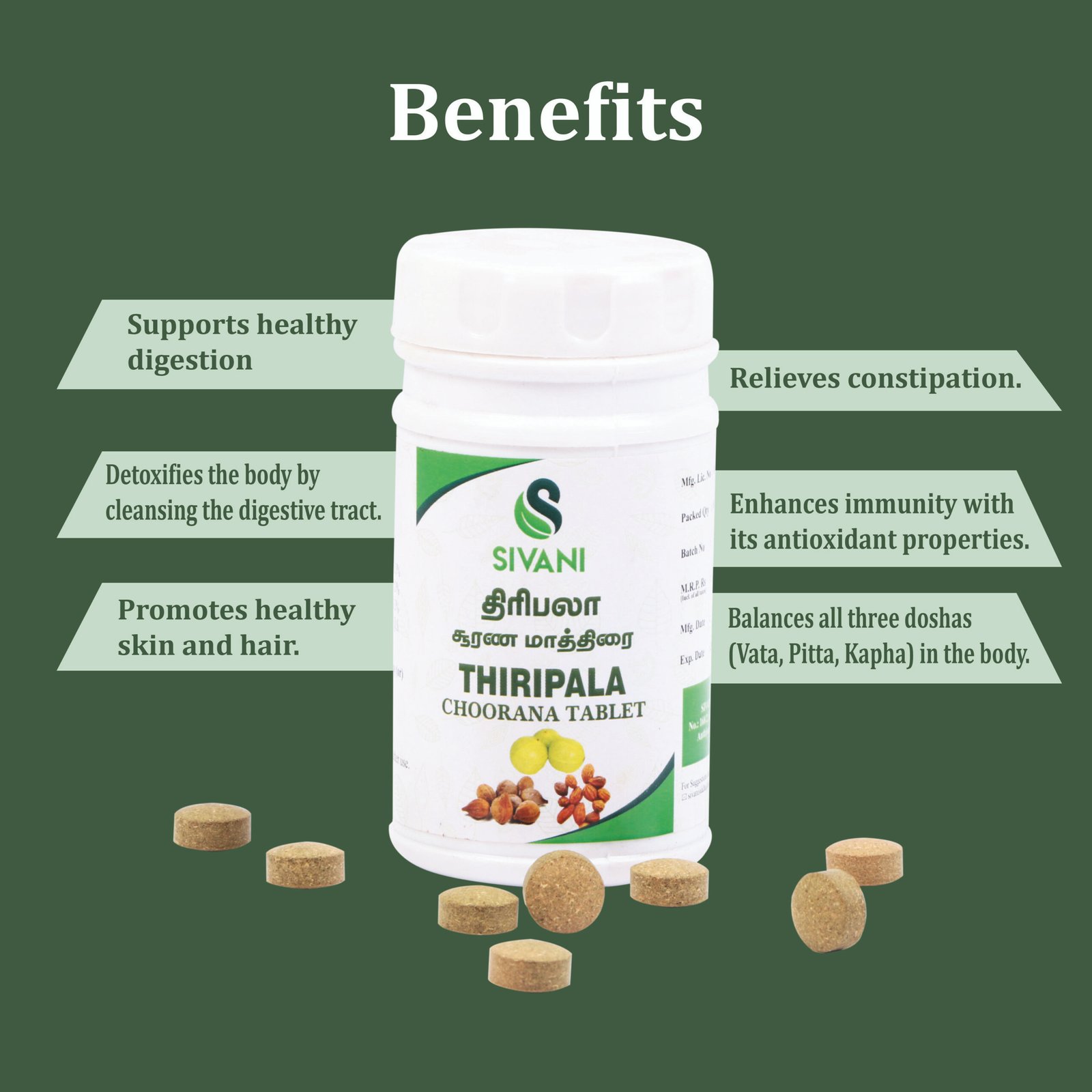 Thiripala Choorana Tablets are prepared using the classical Siddha formulation of three powerful fruits, processed into easy-to-consume tablets. This formulation helps cleanse the digestive system, improve gut function, and balance Vatham, Pitham, and Kabham.